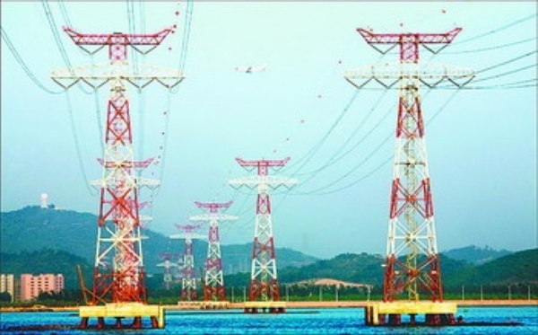 左图 位于深圳西部海域的前湾电厂220千伏前平线海上线路,是我国首条大规模海上高压架空线路,它的建成投产,有力解决了深圳西部地区电源供应紧缺问题。