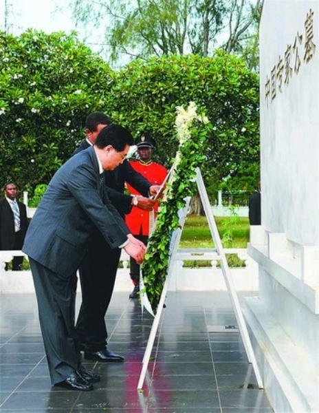 今天,正在非洲大陆进行友好合作之旅的胡锦涛主席,在紧张的日程中专门来到这里,凭吊这些为中非友谊、非洲发展而献身的烈士们,表达祖国人民对他们的无尽思念。