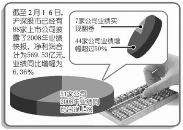 本报讯 记者张衍报道:截至2月16日,沪深两市已经有88家上市公司披露了2008年业绩快报,净利润合计为569.53亿元,与2007年净利润相比增加了34.07亿元,业绩同比增幅为6.36%。