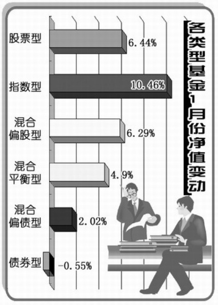 随着上证综指1月份单月9.33%的涨幅,除债券型基金外,其他各类型基金的净值均迎来了不同程度的上涨。按银河证券的分类,股票型基金1月份平均上涨了6.44%,指数型基金1月份平均上涨了10.46%,混合偏股基金为6.29%,混合平衡基金为4.9%,混合偏债基金的平均收益也上涨了2.02%。然而,受累于国债指数的连续下挫,债券型基金1月份的平均收益率下跌了0.55%。