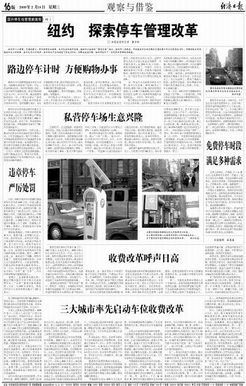 纽约市现有停车计时表7.59万个。2007年收入1.14亿美元,2008年收入估计达到1.2亿美元。不过,业内人士分析,纽约市路边停车管理,也有其自身弊端。与室内停车库相比,路边停车收费过低,甚至不及私营车库收费的十分之一。这种收费导向,实际上是在鼓励人们多驾车出行,导致路边车位难求,而一些好不容易找到车位的驾车人,也就尽量用足停车时间。其他车辆只能四处寻找车位,既浪费汽油,又污染空气,还加剧了非法停车和交通拥挤现象。