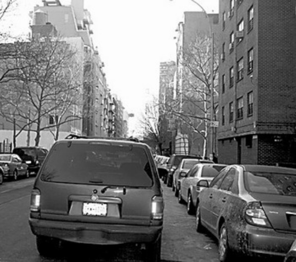 图为美国纽约曼哈顿路边免费停放的车辆及等待车位的多功能运动车。张介岭摄