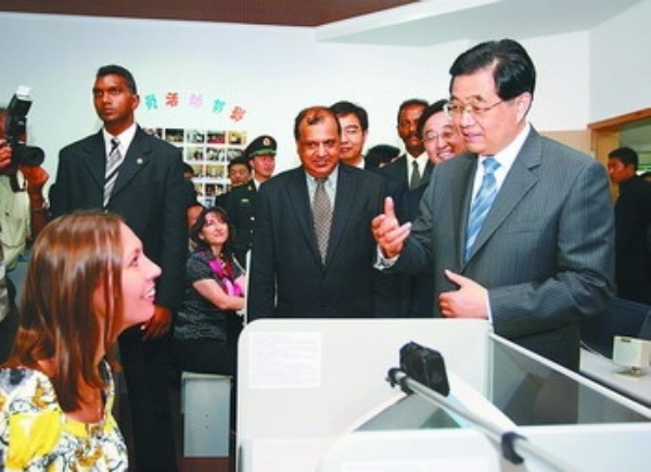 胡锦涛高兴地对学员们说:“学习汉语可以使我们双方有更好的交流工具。欢迎你们到中国去!”