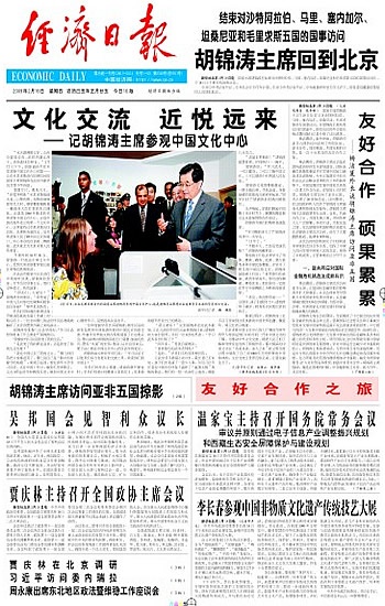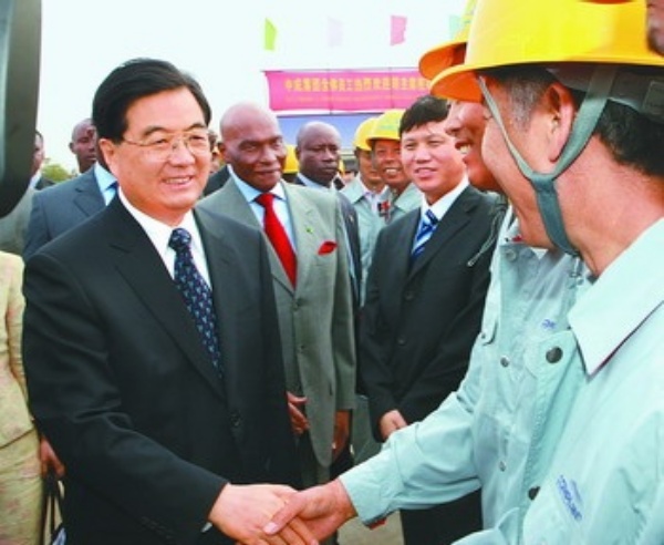 | 二月十四日,国家主席胡锦涛在塞内加尔首都达喀尔视察我援塞国家大剧院工地。这是胡锦涛主席同参加援建的中国工程技术人员亲切握手。 新华社记者 饶爱民摄 |