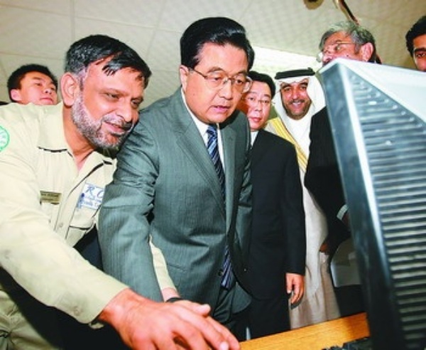 | 二月十一日,国家主席胡锦涛在沙特阿拉伯参观中沙合作的利雅得水泥公司。这是胡锦涛主席在公司中央控制室通过电脑了解企业生产情况。 新华社记者 鞠 鹏摄 |