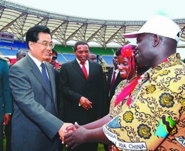 | 二月十五日,国家主席胡锦涛在达累斯萨拉姆出席中国援建的坦桑尼亚国家体育场竣工仪式。这是胡锦涛主席在体育场同参加竣工仪式的坦桑尼亚青年亲切交谈。 新华社记者 饶爱民摄 |