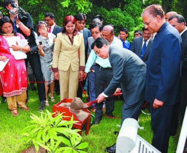 | 二月十七日,国家主席胡锦涛在毛里求斯植物园种植象征中毛友谊万古长青的香木树。