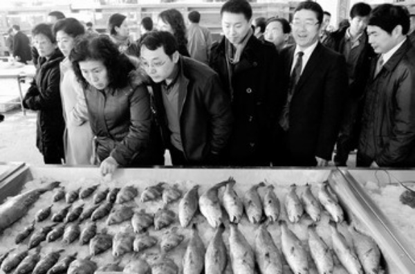 2月13日,餐饮行业代表考察海产品。当日,投资总额达8亿元的天津老板娘国际水产城邀请近500名餐饮行业代表进行采购性参观。据介绍,2008年底开业的天津老板娘国际水产城项目一期营业面积18万平方米,年配送吞吐能力在80万吨以上,年物流配送交易额将突破120亿元,新增就业岗位15000多个。 新华社记者 刘海峰摄