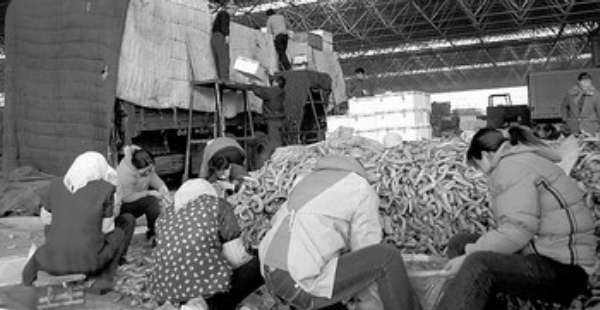 图为菜农在精心挑拣准备装运的蔬菜。