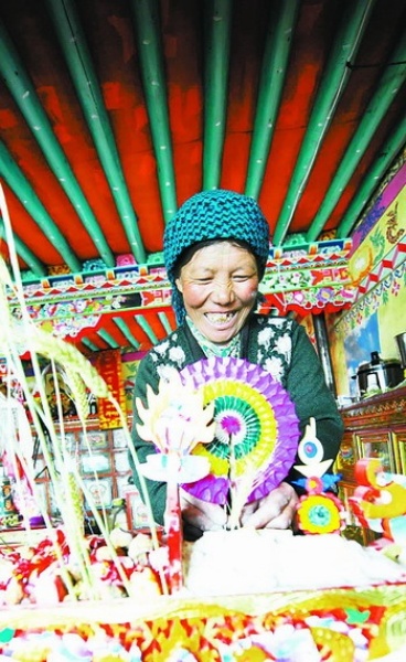 右图 2月21日,西藏山南地区隆子县热荣乡热荣村的村民索朗在做“五谷斗”。随着藏历新年的临近,藏南雪灾中受灾最严重的隆子县热荣乡热荣村家家户户忙着准备各种年货,迎接新年到来。在西藏各级政府的大力帮助下,灾区生产生活目前已经基本恢复。 新华社记者 普布扎西摄