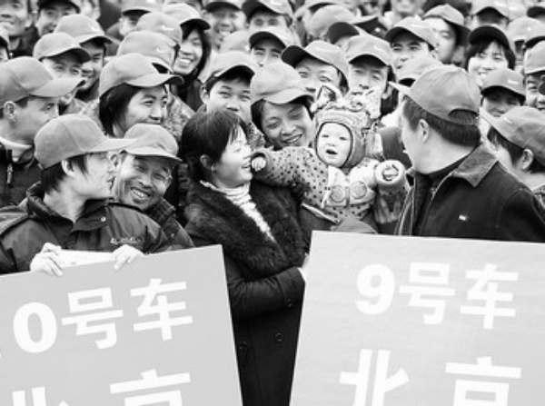 2月16日,在商丘“农民工服务月”启动仪式现场,一名孩子与即将外出打工的亲人告别。商丘市将通过召开招聘会、重点项目用工对接、强化培训、加强用工信息发布等活动促进返乡农民工再就业。