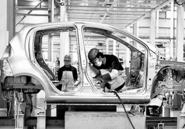 2月23日,吉利汽车集团员工在车体总成组焊线上进行焊接操作。