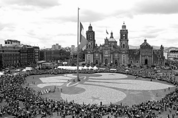 2月22日,在墨西哥首都墨西哥城宪法广场,大约5000名青少年用回收的废旧铝质和塑料瓶组成一个巨大百合花的形状,以此来倡议环保精神。(新华社发)