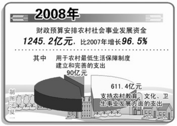 在财政支农资金总量逐年增加的基础上,资金结构不断优化,资金投入的针对性得到提高。近年来,我国公共财政重视改善民生,逐步将农村社会事业发展纳入保障范围。2008年,财政预算安排农村社会事业发展资金1245.2亿元,比2007年增长96.5%,其中,支持农村教育、文化、卫生事业发展方面的支出611.4亿元,用于农村最低生活保障制度建立和完善的支出90亿元。由于财政支农资金重点投向农村社会领域,农民享受的公共服务水平明显提高,从而提高了资金投入的有效性。到目前为止,我国约有1.4亿农村中小学生享受了免除学杂费和免费教科书政策,1100万名家庭经济困难寄宿生享受了生活补贴,逾8.15亿农民被新型农村合作医疗覆盖,4284万农村困难群众享受到最低生活保障。
