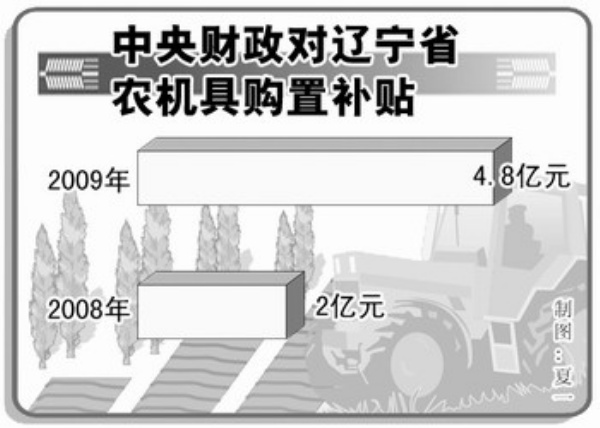 据辽宁省财政厅有关负责人介绍,今年该省农业机械购置补贴大幅增加,补贴范围也进一步扩大。今年,中央财政安排全国购机补贴资金100亿元,其中下达给辽宁省的控制指标为4.8亿元(不含大连),是上年的2.4倍,该省财政还将继续安排部分资金与中央财政资金统筹使用。