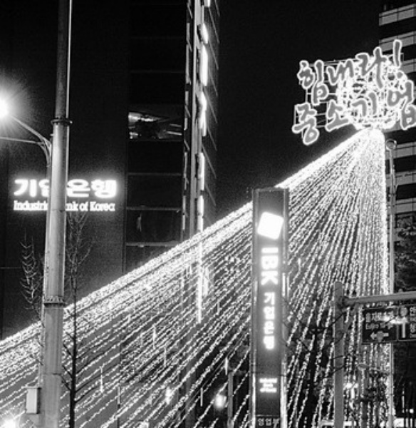 图为韩国企业银行门前的灯光造型上写着“中小企业加油”的字样。顾金俊供