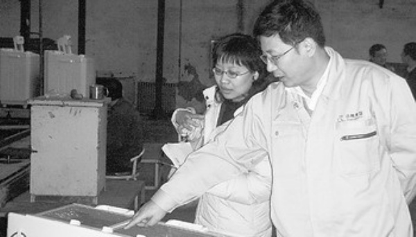 本报记者黄晓芳(左)在山东省济南市小鸭电器有限公司总装车间采访。