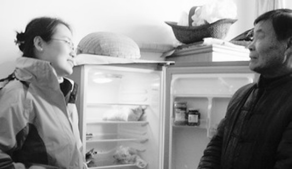本报记者杨学聪(左)在山东省章丘市绣惠镇大夫村采访农民高玉茂。