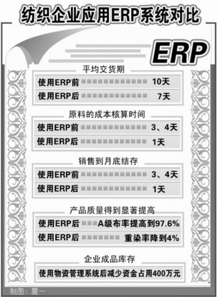 以ERP为代表的企业信息化应用,为纺织企业带来了可观的经济效益。特别是在降低库存,提高生产率,降低生产成本,加快企业反应速度,缩短交货期,提高产品质量,优化生产工艺等诸多方面取得了较大突破,有效地推动了企业经济效益的增长。如广东溢达纺织有限公司在应用了信息系统后,明显提高了对市场的快速反应能力,其产品交货期由原来的平均40天下降为25天—30天;鄂尔多斯集团应用信息管理系统后,制造成本降低了10%左右,管理人员减少了约10%,生产能力提高10%—15%,工作效率提高10%—20%。