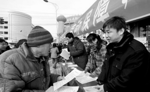2月25日,济南历城区劳动保障部门工作人员在招聘会现场向求职者发放宣传材料。