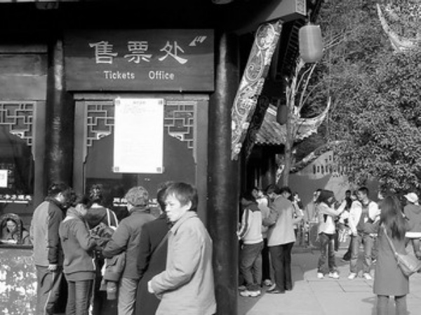 游客在青城山风景区售票处排队购票。青城山位于成都西北的都江堰市,是我国著名的国家级风景名胜旅游地。受地震的影响,景区游客一度锐减,经过灾后重建,青城山景区旅游人数正不断增加。本报记者 刘志奇摄
