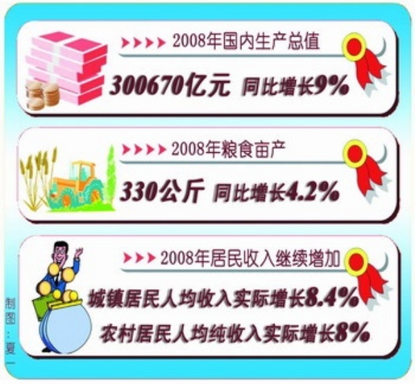 新年伊始,国家统计局发布的初步核算数据显示,2008年全年国内生产总值为300670亿元,比上年增长9%。
