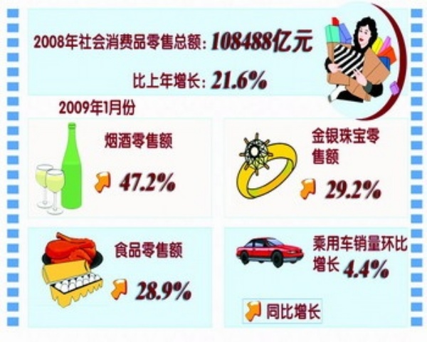 来自国家统计局的最新统计数据显示,2008年全年社会消费品零售总额108488亿元,比上年增长21.6%,增速比上年加快4.8个百分点。面对国际金融危机带来的冲击,消费的增长为2008年我国经济实现平稳较快发展做出突出贡献。
