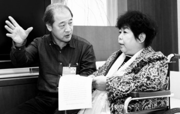 3月2日,出席全国政协十一届二次会议的全国政协委员王书平(左)一到驻地,就找到全国政协委员秦百兰,就他的关于解决农村残疾人社会保障问题的提案征求意见。王书平准备了有关新农村文化建设、城市社区服务等内容的提案共5份。新华社记者 刘卫兵摄