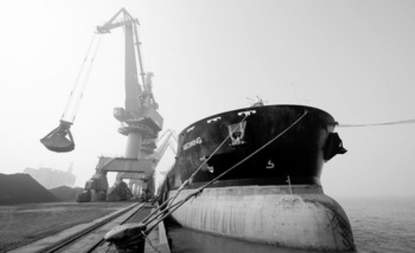 这是一艘轮船停泊在曹妃甸散货码头卸货(3月1日摄)。