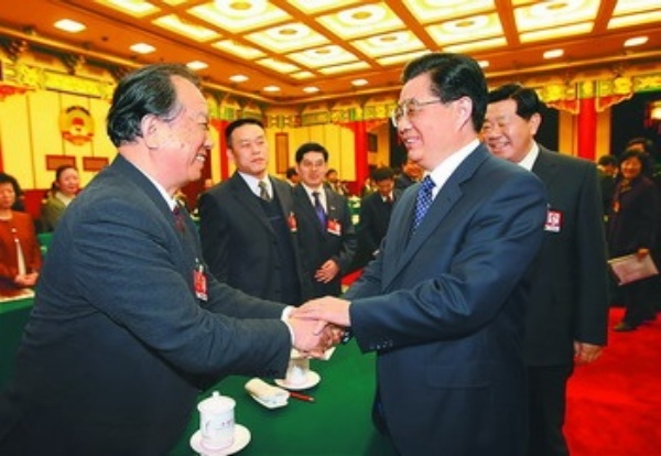 4日下午,胡锦涛参加了民盟、民进界委员联组会。会上,吴正德、史贻云、潘贵玉、梁晓声等12位委员先后发言,大家各抒己见,会场气氛十分活跃。在听取委员们发言后,胡锦涛就确保粮食安全、加强农村教育、发展新能源汽车等话题同大家交流看法,并作了重要讲话。他指出,今年是新中国成立60周年,是应对国际金融危机冲击、保持我国经济平稳较快发展的关键一年。切实做好保增长、保民生、保稳定各项工作,对于维护改革发展稳定大局,推进全面建设小康社会进程,具有十分重要的意义。全国各党派、各团体、各民族、各阶层、各界人士要把思想和行动统一到中央对经济形势的分析判断上来、统一到中央的决策部署上来,发扬伟大民族精神,坚定信心、同心同德,迎难而上、共克时艰。胡锦涛希望各民主党派、工商联和无党派人士紧紧围绕党和国家工作大局,为完成保持经济平稳较快发展的首要任务作出新贡献;紧紧围绕深入实施科教兴国战略,为推进建设创新型国家进程作出新贡献;紧紧围绕推动社会主义文化大发展大繁荣,为提高全民族思想道德素质和科学文化素质作出新贡献。胡锦涛强调,中国共产党领导的多党合作和政治协商制度确立60年来的实践充分证明,坚持和完善这一制度,符合全国各族人民的根本利益,体现了社会主义民主政治的本质要求。要在深入总结这一制度60年来伟大实践和宝贵经验的基础上,进一步把各民主党派参政议政、民主监督职能履行好、发挥好,进一步把中国共产党领导的多党合作和政治协商制度巩固好、发展好。贾庆林参加了看望和讨论。