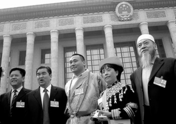3月3日下午,青海省出席全国政协十一届二次会议的部分政协委员在人民大会堂前合影。 本报记者 马玉宏摄
