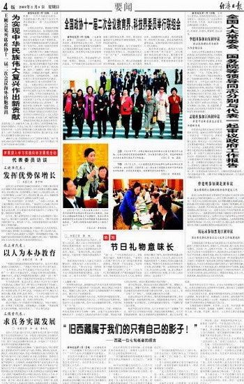程惠芳代表回忆,“去年三八妇女节时,我们刚刚战胜了严重的低温雨雪冰冻灾害。当时我也在北京开人大会,省领导给我们赠送了鲜花,我们感到特别激动和幸福。今年又逢三八妇女节,我们正在党和政府的领导下,积极应对国际金融危机的挑战。”程惠芳代表看着这份特殊的节日礼物,深有感触:“我一定要更加努力地工作,和全国的女同胞一起,真正撑起半边天。只要我们同心同德,齐心协力,祖国的明天一定会更好!”□ 本报记者 张 双