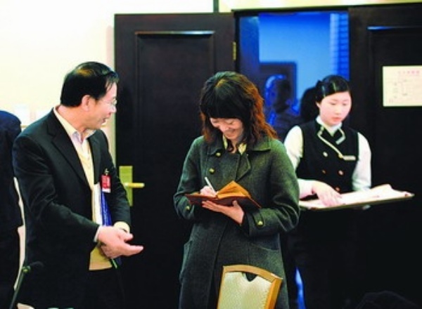 内蒙古农业大学副校长侯先志委员(左一)正在就大学生就业问题接受记者采访。本报记者 赵晶摄