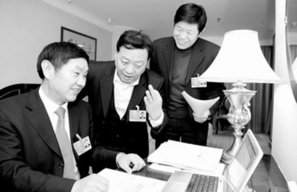 3月8日晚,人大河南代表团驻地,刘国庆代表(左)、朱广平代表(中)和张晓阳代表(右)就政府工作报告中提出的全面加强以改善民生为重点的社会建设交换意见。虽然已近深夜,但3位代表意犹未尽,仍在继续探讨。本报记者 李景录摄