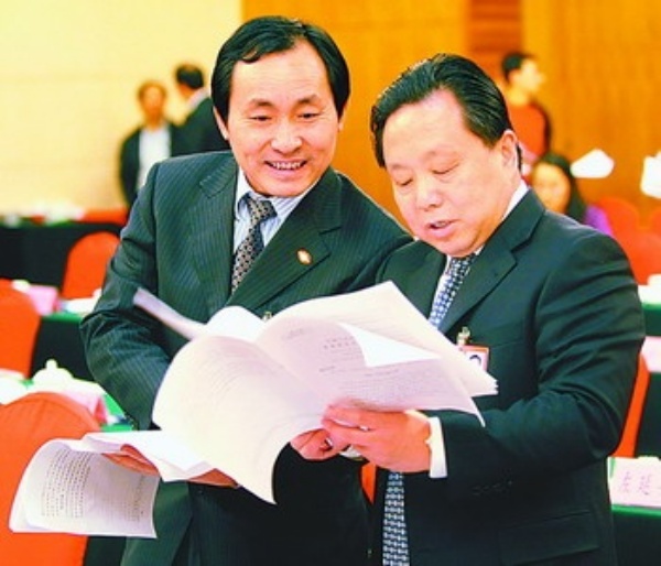 下图 3月9日下午,人大安徽代表团审议全国人大常委会工作报告。审议结束后,朱读稳代表(左)与王福宏代表继续交流意见。 本报记者 李景录摄