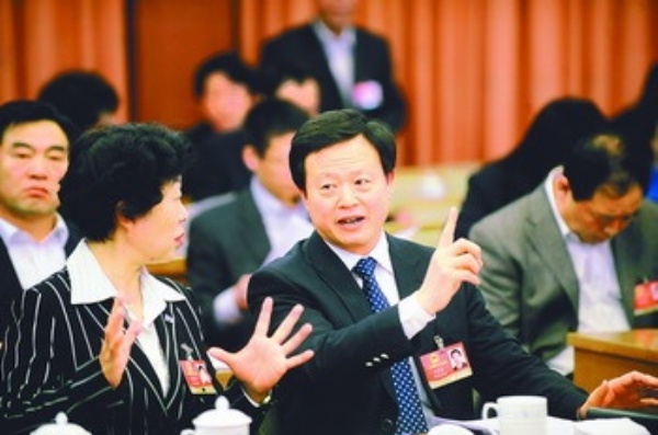 左图 3月9日下午,人大河北代表团审议全国人大常委会工作报告。王爱民代表(左二)就报告中的相关内容与同团代表相互讨论。本报记者 李景录摄