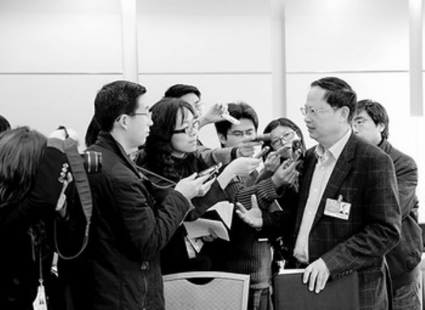 3月9日上午,政协经济界委员在驻地进行小组讨论。会后,王建宙委员被记者围住,回答有关经济发展方面的提问。 本报记者 赵晶摄