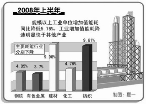 钢铁行业在继续大力推广应用节能减排工艺技术,推进钢铁企业联合重组步伐的同时,加大淘汰落后和低水平工艺装备的工作力度,提高全行业整体工艺装备和技术水平,推进装备的大型化、现代化。根据国务院《节能减排综合性工作方案》,2010年前淘汰落后炼铁能力1亿吨,炼钢能力5500万吨。这些目标实现后,中国钢铁工业将节能1700万吨标准煤,减排二氧化硫9万吨,节水3000万吨;2010年将节能5000多万吨标准煤,减排二氧化硫40多万吨,节水1亿吨。