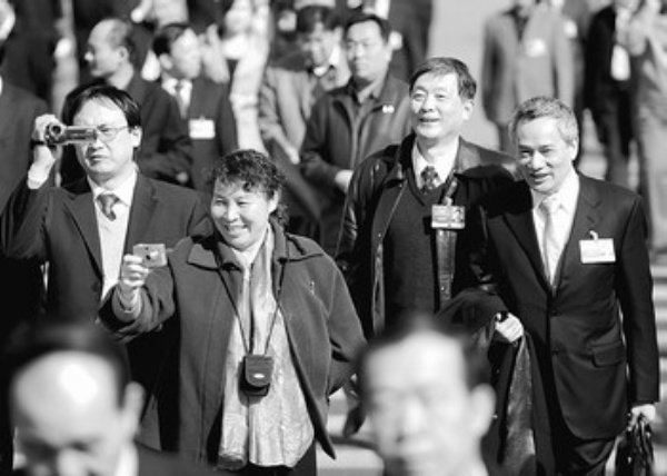 3月9日15时,全国政协十一届二次会议在人民大会堂举行第四次全体会议。委员们入场时摄影拍照,留下更多精彩瞬间。本报记者 赵晶摄