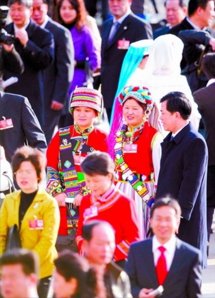 3月9日上午,十一届全国人大二次会议举行第二次全体会议。入场时,身着民族服装的少数民族代表特别引人注目。本报记者 李景录摄
