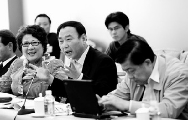 | 3月10日,出席全国政协十一届二次会议的经济界委员在驻地进行讨论。闫冰竹委员(中)发言,内容涉及促进中小企业融资、完善农村社会养老保险、促进中小银行发展等多个方面。