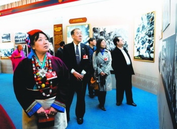 3月11日,出席全国政协会议的部分委员参观“西藏民主改革50年大型展览”。美朵曲珍(左一)委员对每一幅照片、每一件展品都看得特别认真仔细。本报记者 赵 晶摄