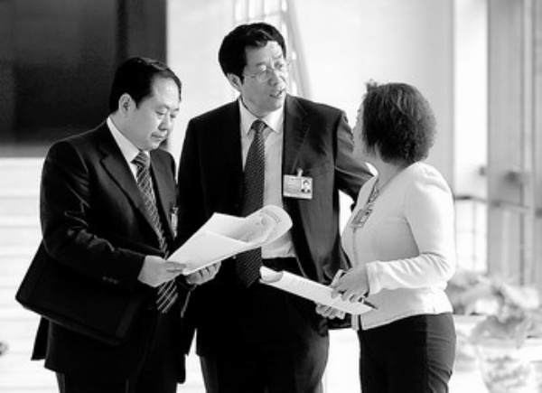 3月11日上午,人大陕西代表团审议两高报告后,史贵禄代表(左)、冯钧平代表(中)和赵喜林代表的一致看法是,两高报告内容扎实,数字准确。本报记者 李景录摄