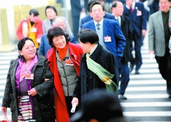 3月12日上午,全国政协十一届二次会议在北京人民大会堂胜利闭幕。这是入场时委员们在交谈。本报记者 赵晶摄