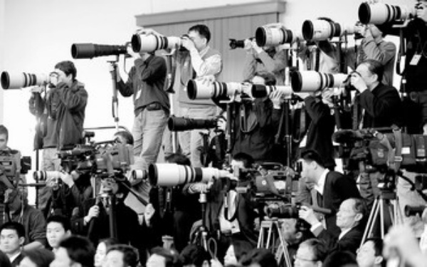 3月13日,国务院总理温家宝在人民大会堂三楼中央大厅与中外记者见面,并回答记者的提问。记者会历时2小时20多分钟,1000多名中外记者参加,这是记者在拍摄采访。  本报记者  李景录摄