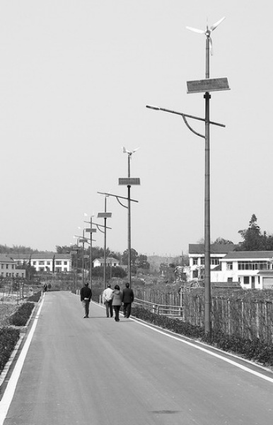 记者在湖南省益阳市谢林港镇清溪村见到了这种风光互补发电的高科技路灯,深切感受到高科技给农村带来的变化。