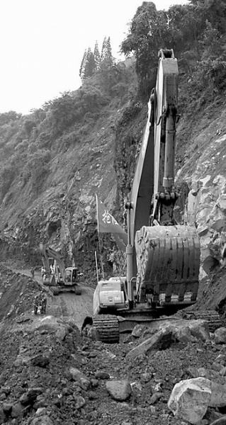 下图 武警交通一总队官兵冒死抢通在汶川大地震中损毁的都江堰至映秀镇“生命通道”。