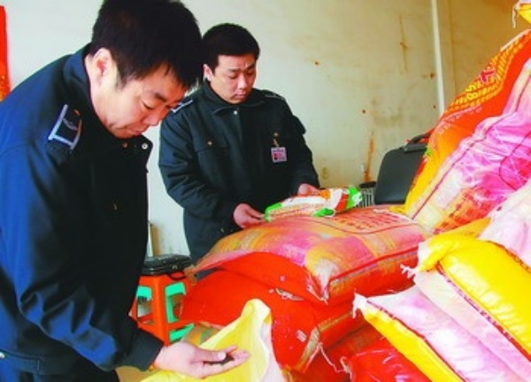 3月17日,内蒙古通辽市技术监督部门和农业部门联合检查组工作人员在检查种子市场,保障农民利益和春耕生产安全。新华社记者 李欣摄
