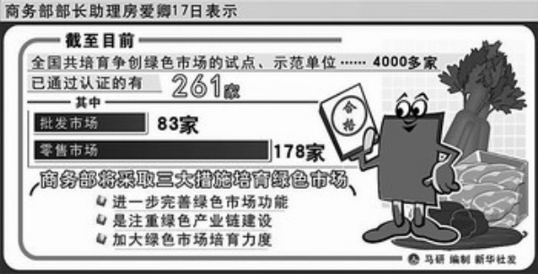 在全国,像顺鑫石门农产品批发市场一样的绿色市场正逐渐增多。商务部部长助理房爱卿说,培育绿色市场是实施“三绿工程”的核心内容,商务部和各地流通主管部门这些年坚持积极开展绿色市场培育工作。截至目前,全国共培育了4000多家争创绿色市场的试点、示范单位,已通过认证的达261家,其中批发市场83家,零售市场178家。