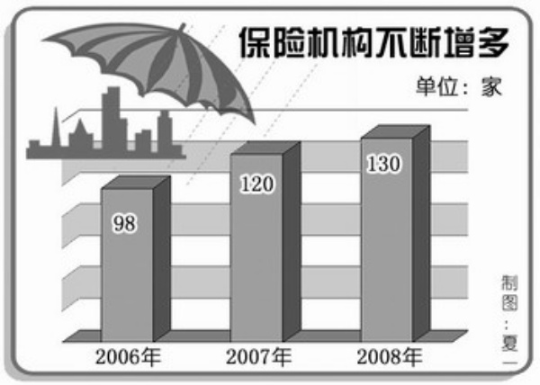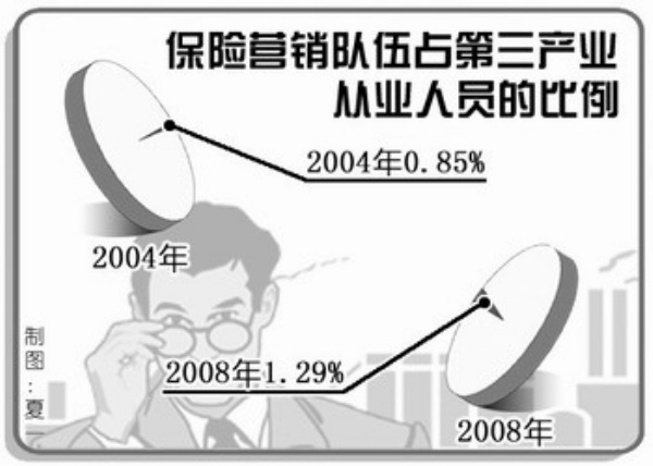 保险业吸纳就业能力为何快速增长?这首先得益于近年来保险业一直处于快速的发展状态。2008年,保险业实现原保险保费收入9784.1亿元,比上年增长39.1%,成为2002年以来增长最快的一年。市场主体在不断增加,2008年末,保险市场主体由2007年的120家增加到130家。新增岗位不断释放,单以保险业从业的主力军保险营销队伍来说,2007年增长趋势开始明显。两年中,保险营销员数量从2006年底的155.8万人发展到2008年末的254.1万人,净增98.3万人,平均每个季度增加12.3万人。截至2008年末,实现保费收入3380亿元,占总保费收入的34.55%。近三年来,保险营销队伍占到保险从业人员总人数75%左右,占第三产业从业人员的比例由2004年的0.85% 增加至2008年的1.29%。而目前的共识是,这种趋势在今明两年还会继续保持。